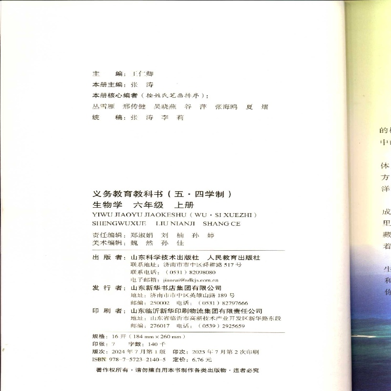 2025五四制6六年级上册生物学义务教育教科书初中课本教材鲁科版 社 山东科学技术出版