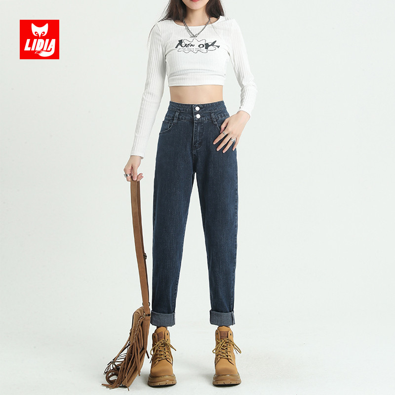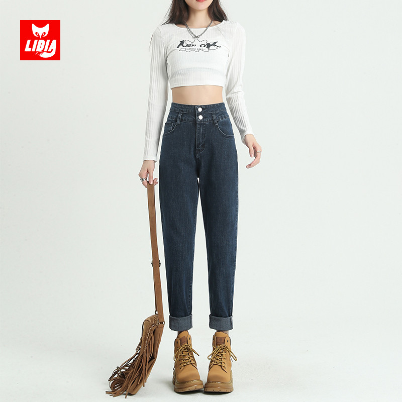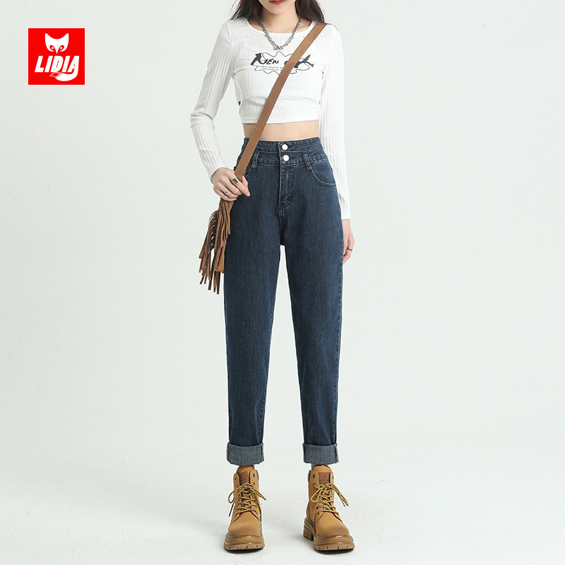 烫钻高腰棉喇叭裤 MISSCOCOON可可尼深蓝色牛仔裤 女2025秋冬新款