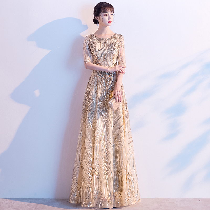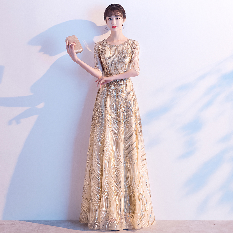 一字肩晚礼服开衩亮片明星同款 长裙女 成人礼毕业连衣裙主持人晚装