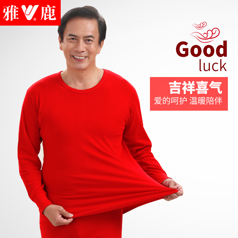 雅鹿大红色中老年人本命年保暖内衣套装 属马年妈妈爸 纯棉秋衣秋裤