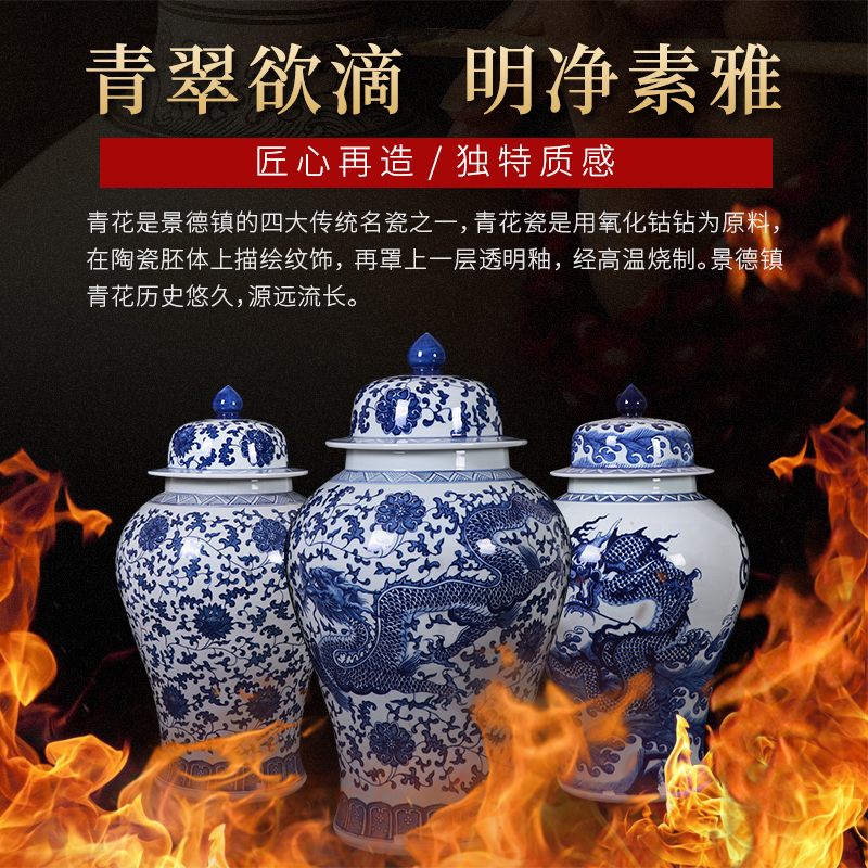 景德镇陶瓷将军罐手绘仿古青花瓷瓶中式 落地客厅大号带盖花瓶摆件