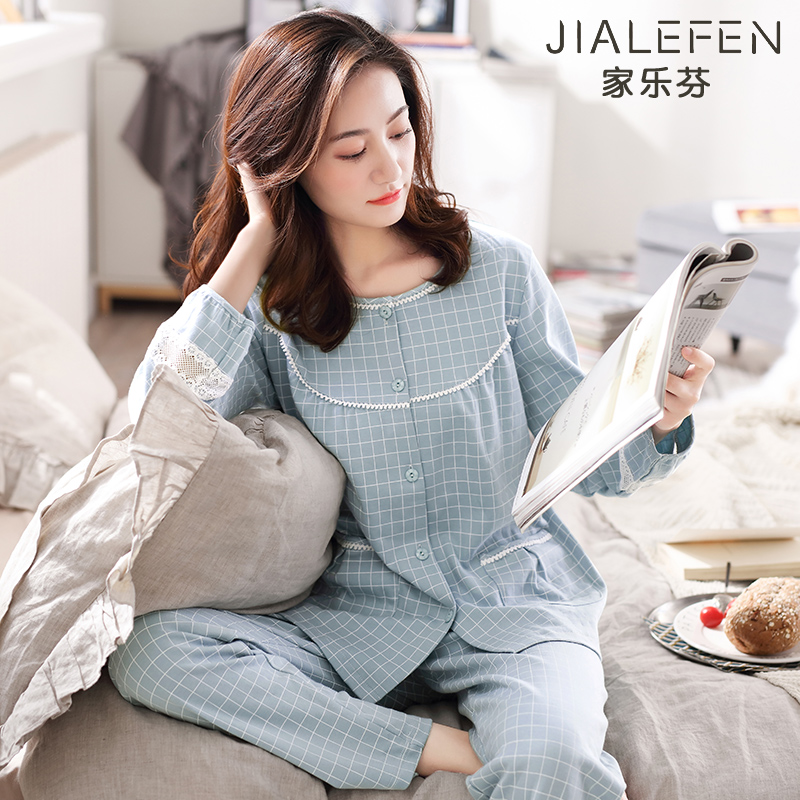 家居服秋冬薄款 纯棉长袖 韩版 清新大码 睡衣女士春秋款 套装 秋季