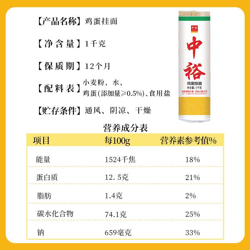 中裕鸡蛋挂面1kg 汤面拌面方便速食家用面食小面干面条劲道爽滑
