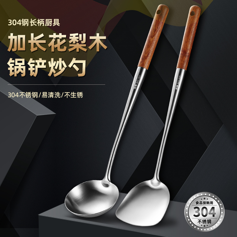 炒铲加长柄锅铲304不锈钢炒勺长柄炒菜铲子木柄防烫隔热家用漏勺