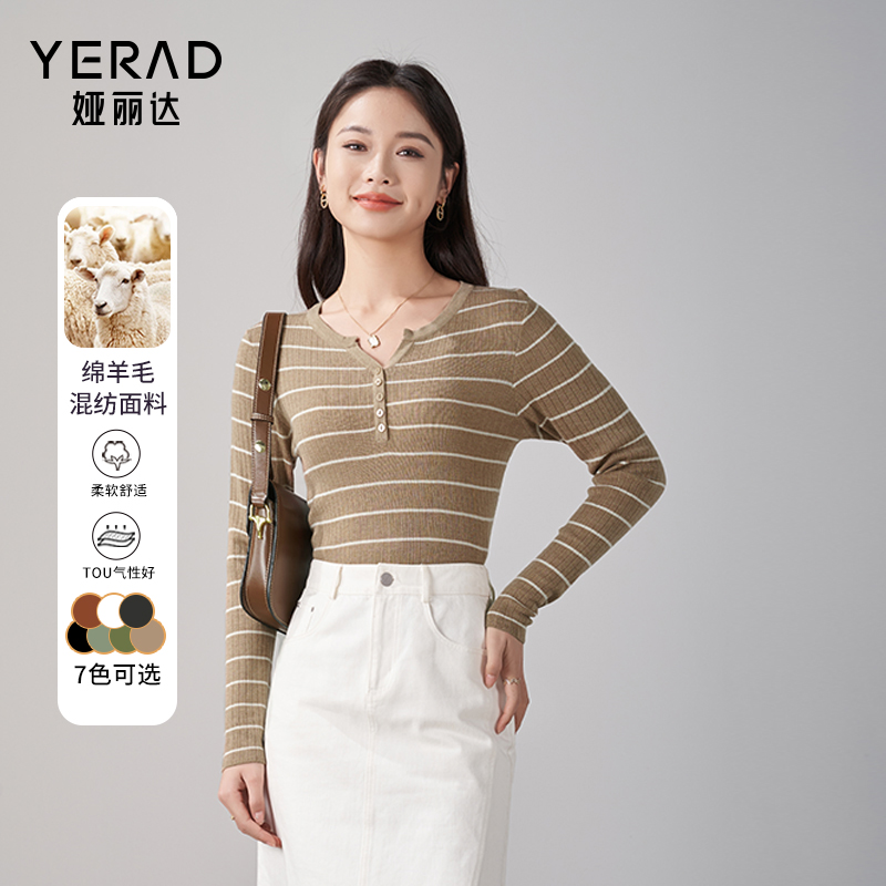 上衣小个子气质T恤打底衫 娅丽达v领条纹羊毛针织衫 女2025春秋新款