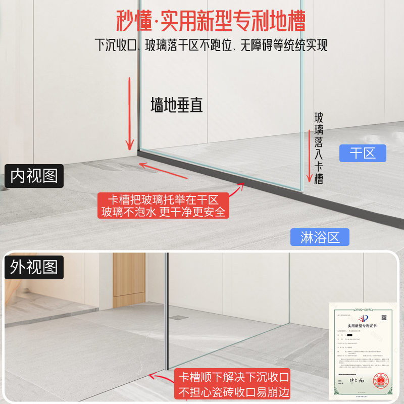 心晴下沉式 无框淋浴房平开门预埋到顶无障碍进出干湿分离淋浴隔断