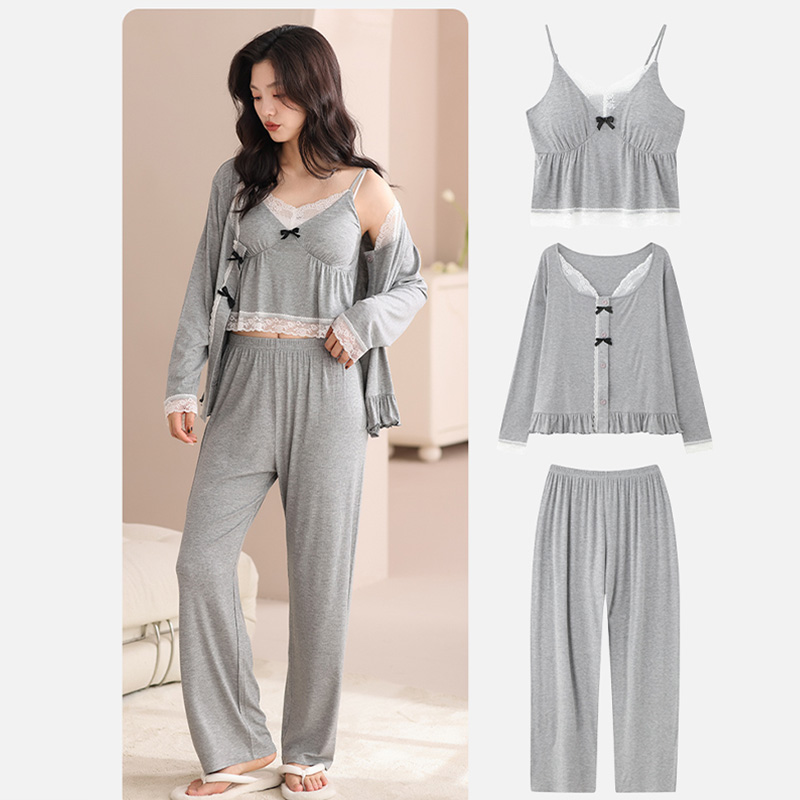 2025莫代尔睡衣女春秋款 纯欲性感吊带三件套带胸垫蕾丝家居服套装