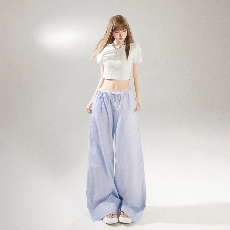 慵懒抽绳蕾丝垂感拖地裤 新款 女2025春季 KRO低腰条纹阔腿休闲裤