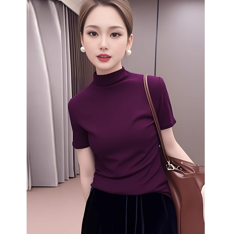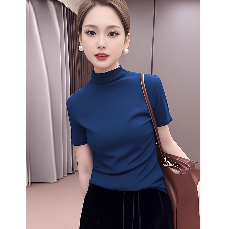 显瘦中袖 梵姿倪半高领t恤女2025春夏季 内搭薄款 上衣修身 百搭短袖