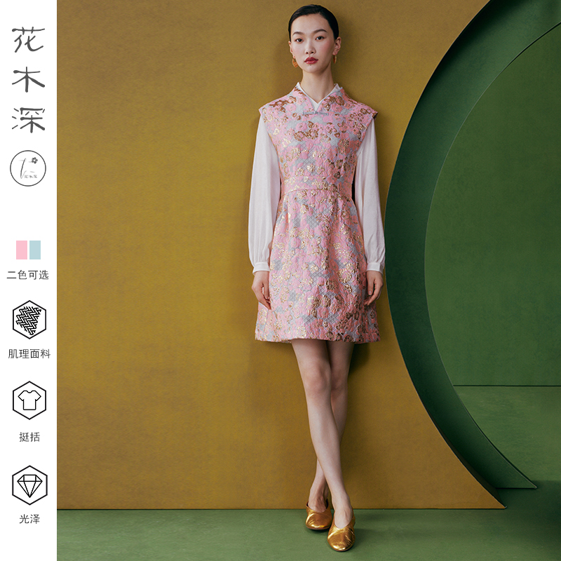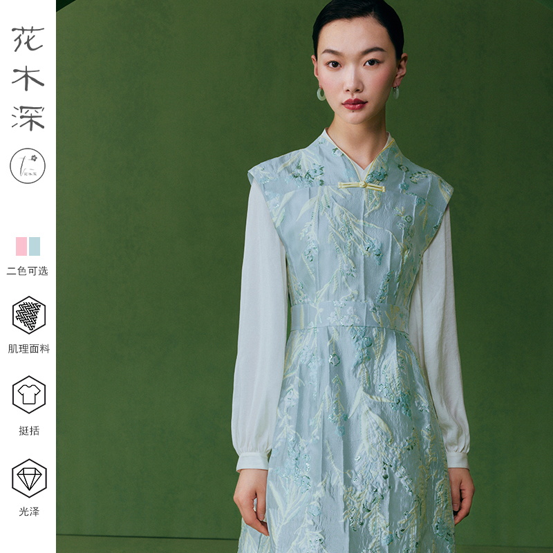 改良旗袍盘扣无袖 花木深中式 连衣裙高腰提花礼服裙 虞书欣同款