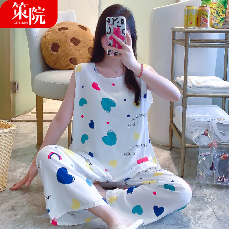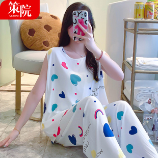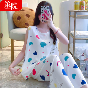 无袖 夏季 棉绸睡衣套装 背心长裤 慵懒人造棉布家居服可外穿 女士薄款