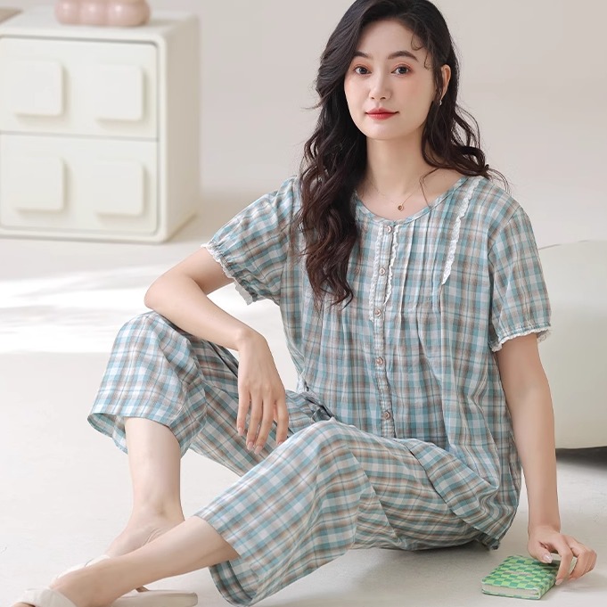 家居服宽松 中年格子全棉舒适薄款 梭织棉纱布睡衣女短袖 纯棉七分裤