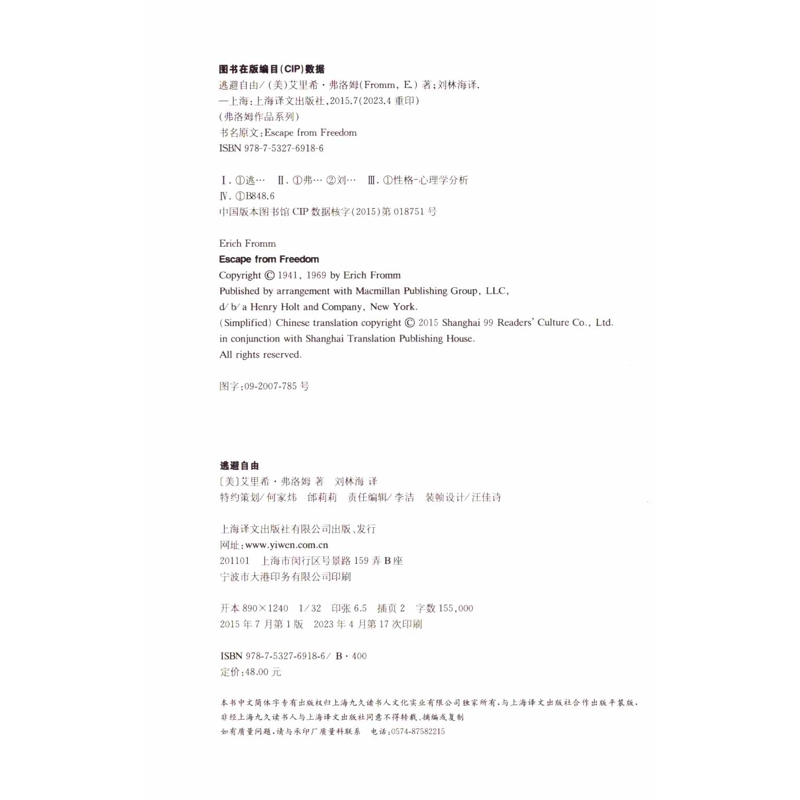 社新华书店正版 心理学上海译文出版 2023 逃避自由