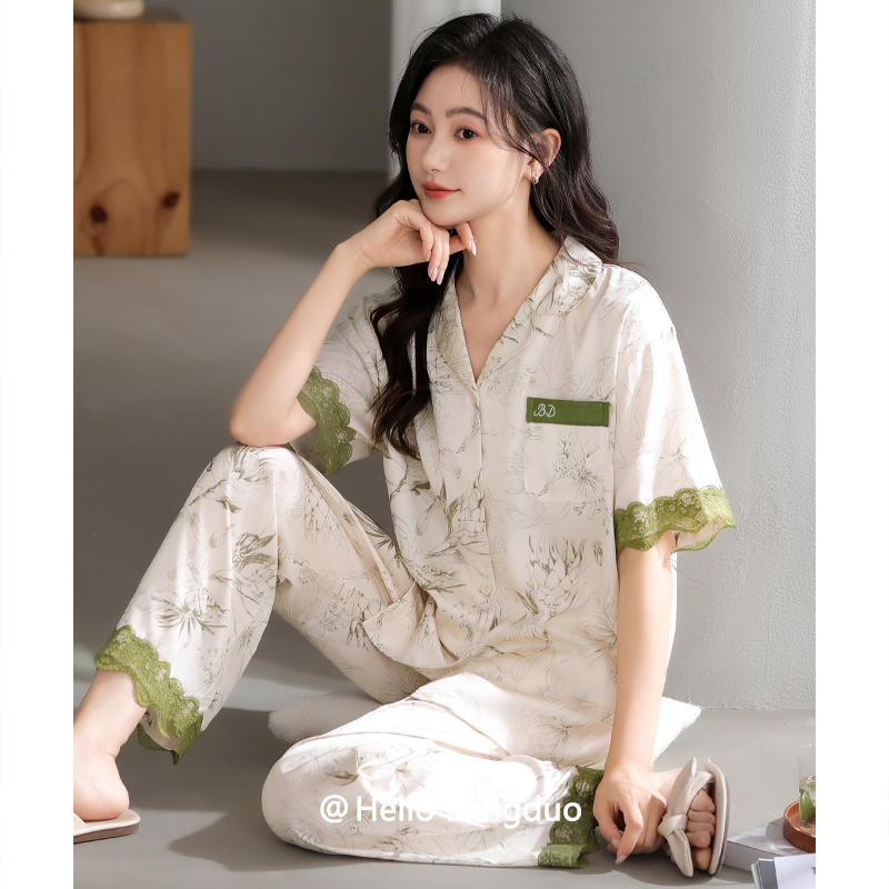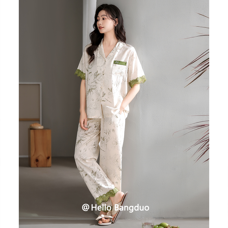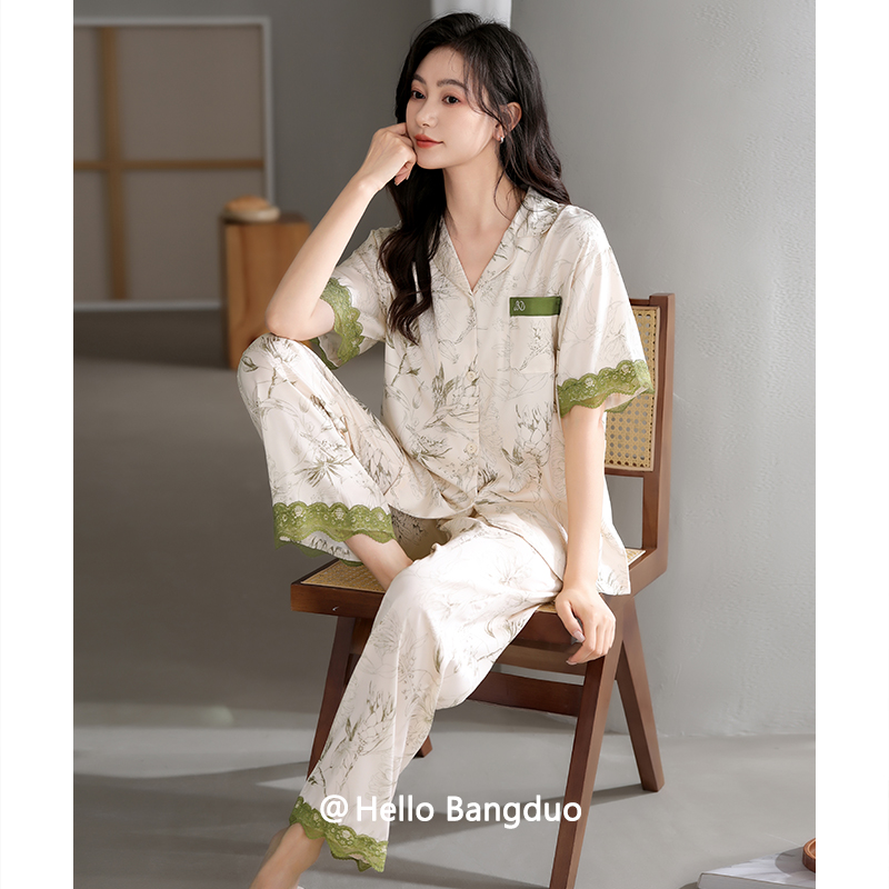 薄款 长裤 夏天仿真丝绸中年妈妈高级感家居服 冰丝短袖 睡衣女士夏季
