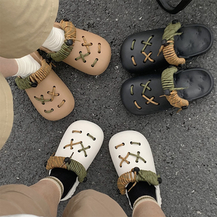 亲子外穿防滑海边沙滩凉拖 ins复古diy绑绳洞洞鞋 细细条 男女夏季