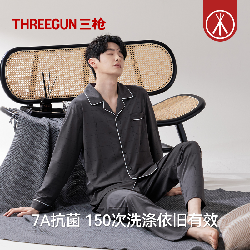 三枪男睡衣纯棉7A抗菌简约印花高级开襟长袖 亲肤可外穿家居服 长裤