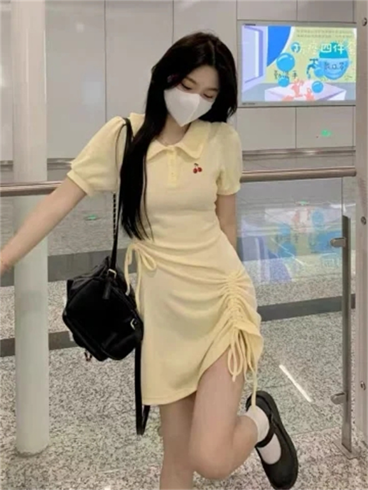 樱桃POLO翻领连衣裙夏季 学院奶甜辣妹抽绳褶皱收腰小个子初恋短裙