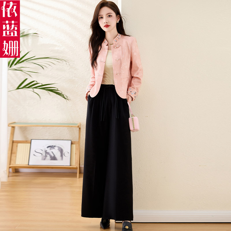 春秋气质复古盘扣提花外套阔腿裤 女2024新款 两件套 国风套装 新中式
