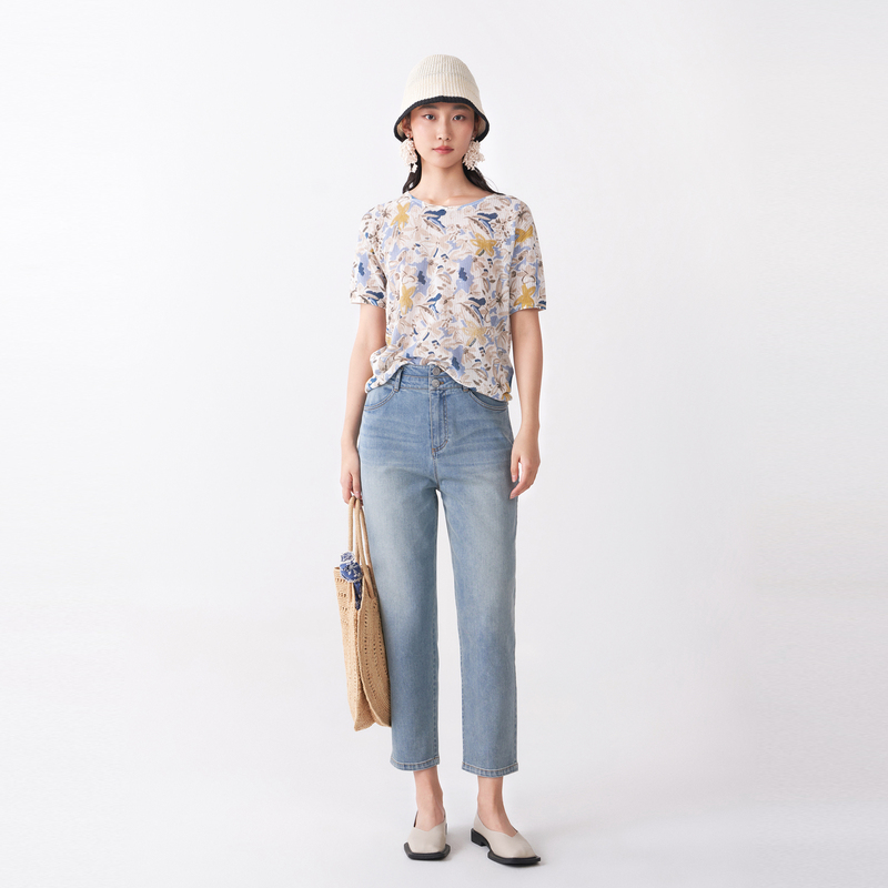 易菲高捻棉印花挑孔宽松针织衫 Yifini 女初秋新款 专柜同款