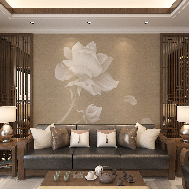 新中式 电视背景墙壁纸素雅白莲花茶馆壁布客厅沙发墙纸5d立体壁画