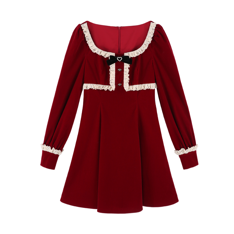 法式 高级感气质a字裙新年战袍小礼裙 红色方领丝绒连衣裙女秋冬季