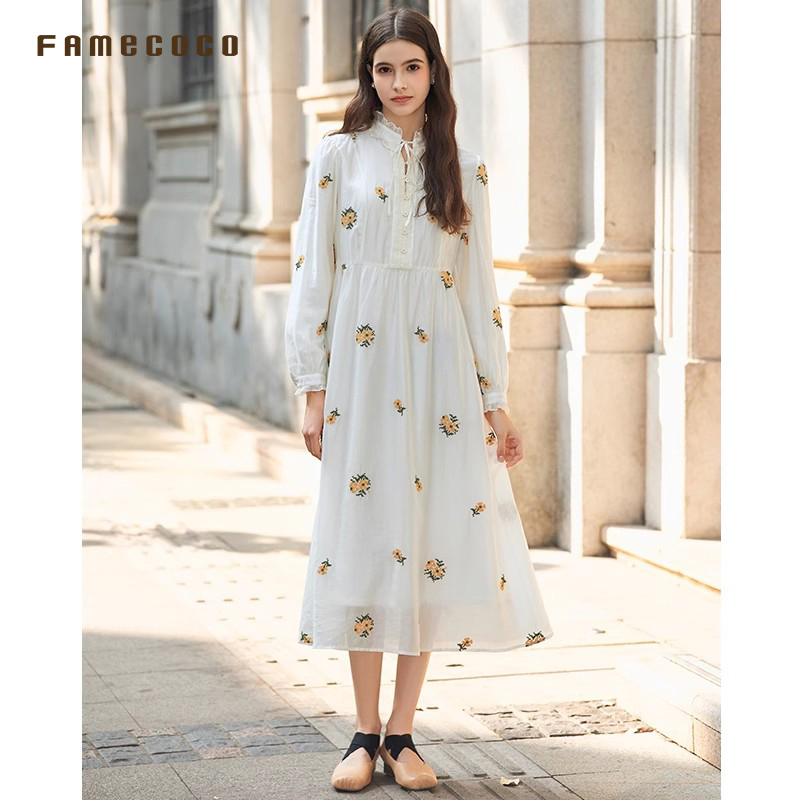 菲梦伊原创钉珠紫色连衣裙女长袖 别致独特绝美收腰百褶长裙子 秋装