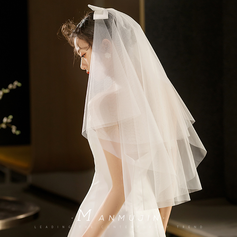 简约精致缎面蝴蝶结头纱新娘结婚登记领证旅拍照头饰求婚白色头纱