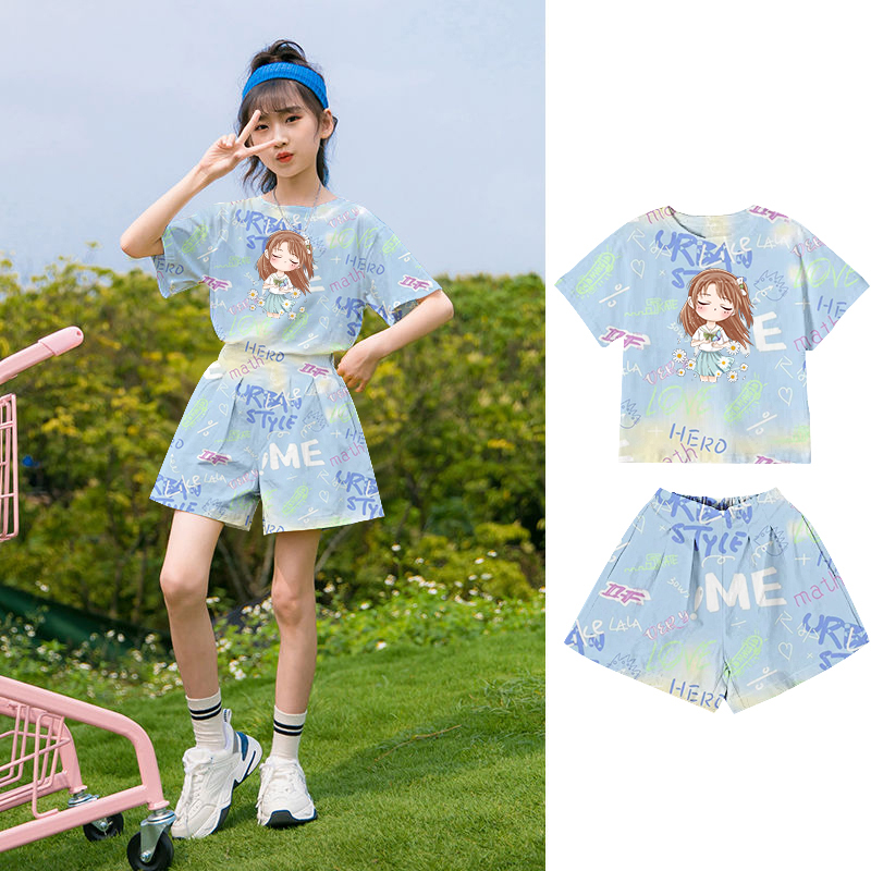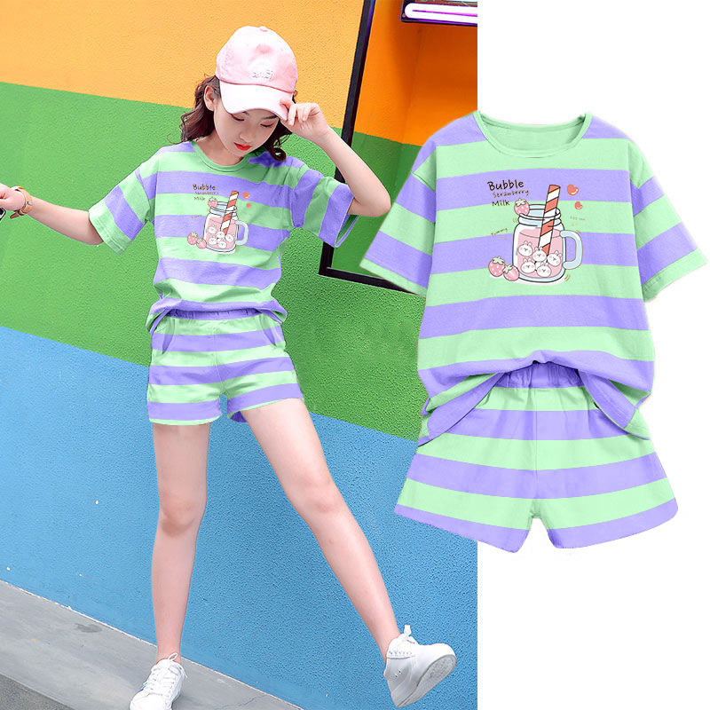 儿童套装 卡通条纹中大童女宝宝衣服童装 女童短款 短款 2025夏季 新款
