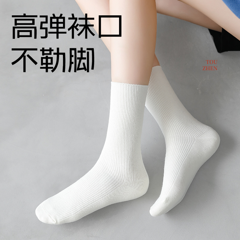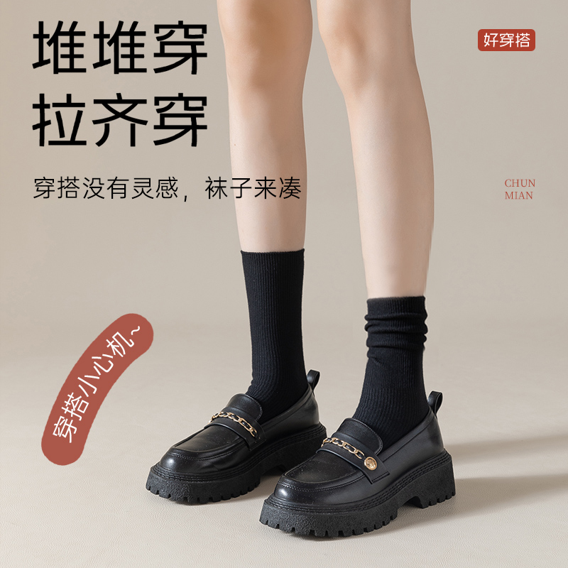 黑色堆堆袜子女中筒袜秋冬款 潮流长筒袜 吸汗防臭白色条纹配小皮鞋