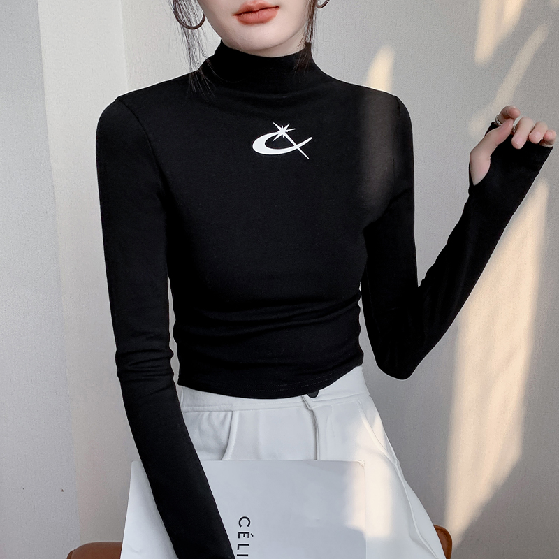 上衣 图案印花加绒正肩打底衫 半高领磨毛长袖 t恤女2024秋冬新品