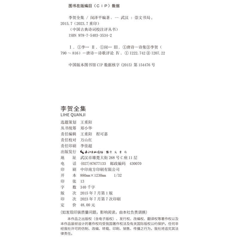 三汇本 闵泽平 正版 李贺全集 书籍 社 中国古典诗词汇校汇注汇评丛书 原湖北辞书出版 当当网 崇文书局