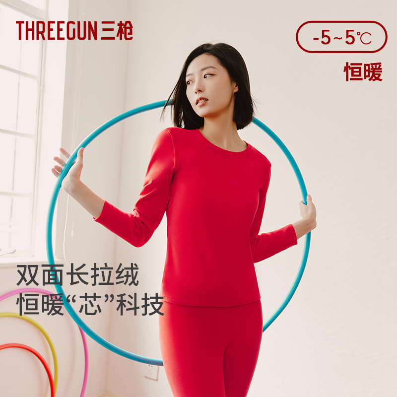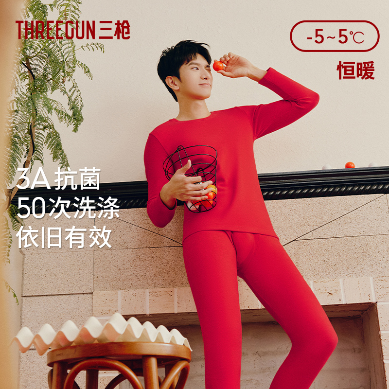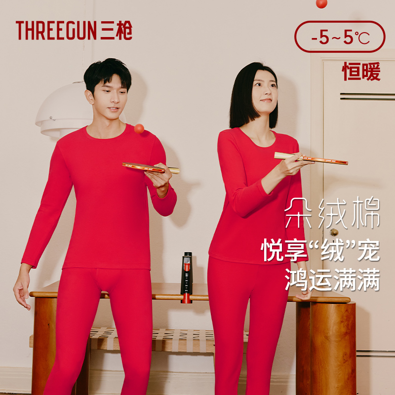 三枪朵绒棉保暖内衣男本命年大红套装 女新年 纯棉拉绒抗菌秋衣秋裤