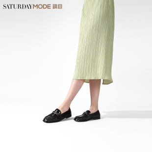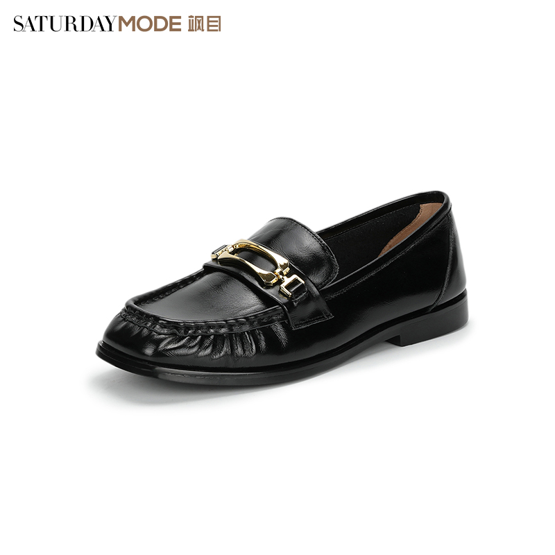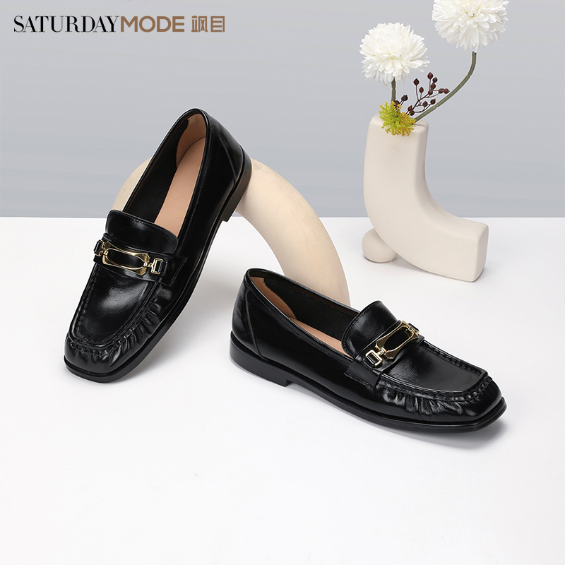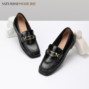 方头低跟软底舒适一脚蹬黑色小皮鞋 新款 女士春季 星期六牛皮乐福鞋