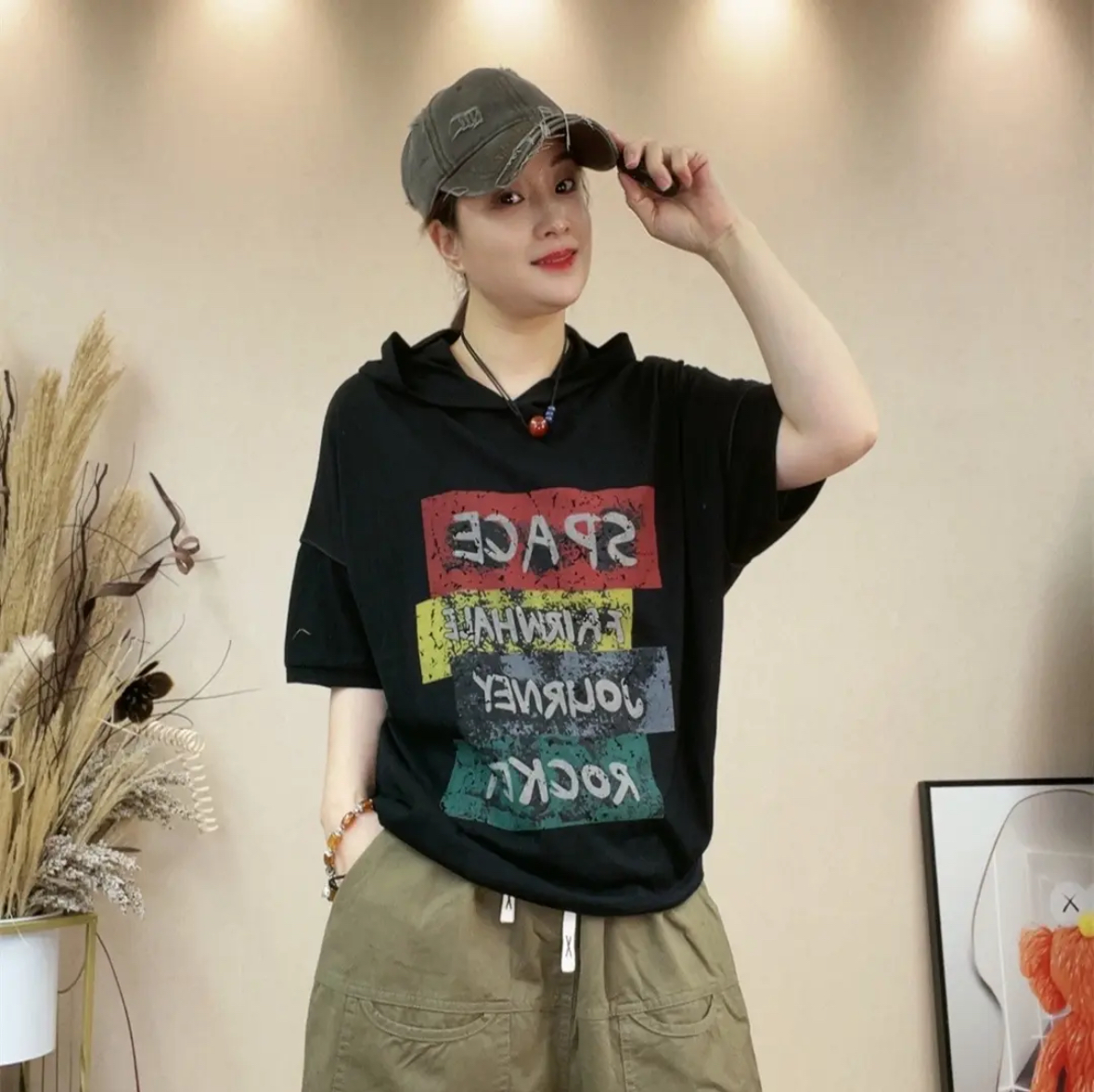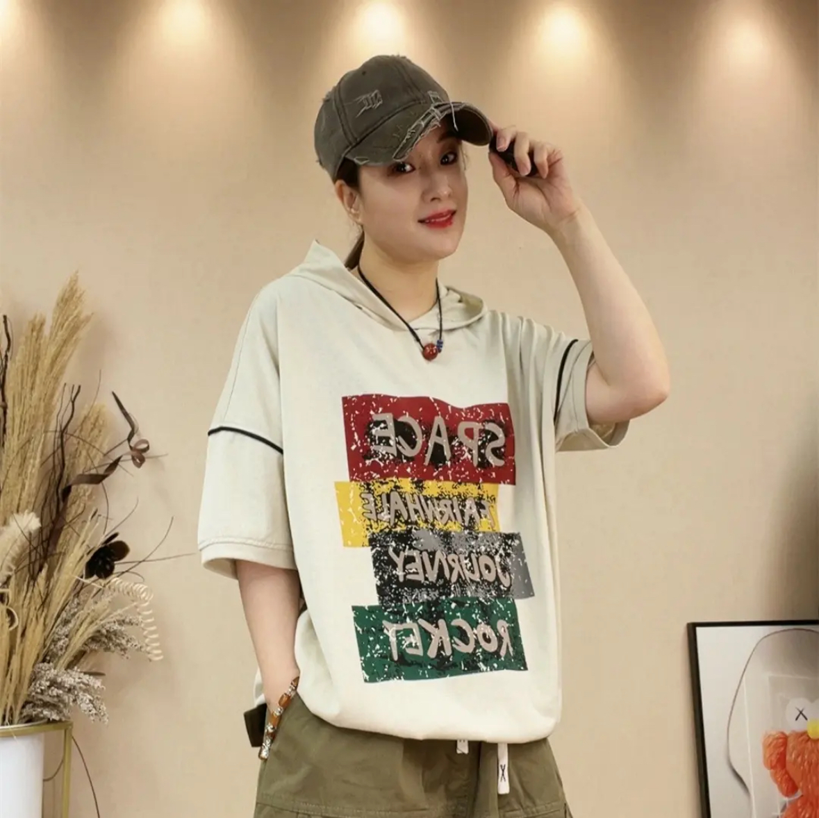 女短袖 减龄字母印花连帽套头卫衣T恤宽松休闲帽衫 韩版 2025年夏季