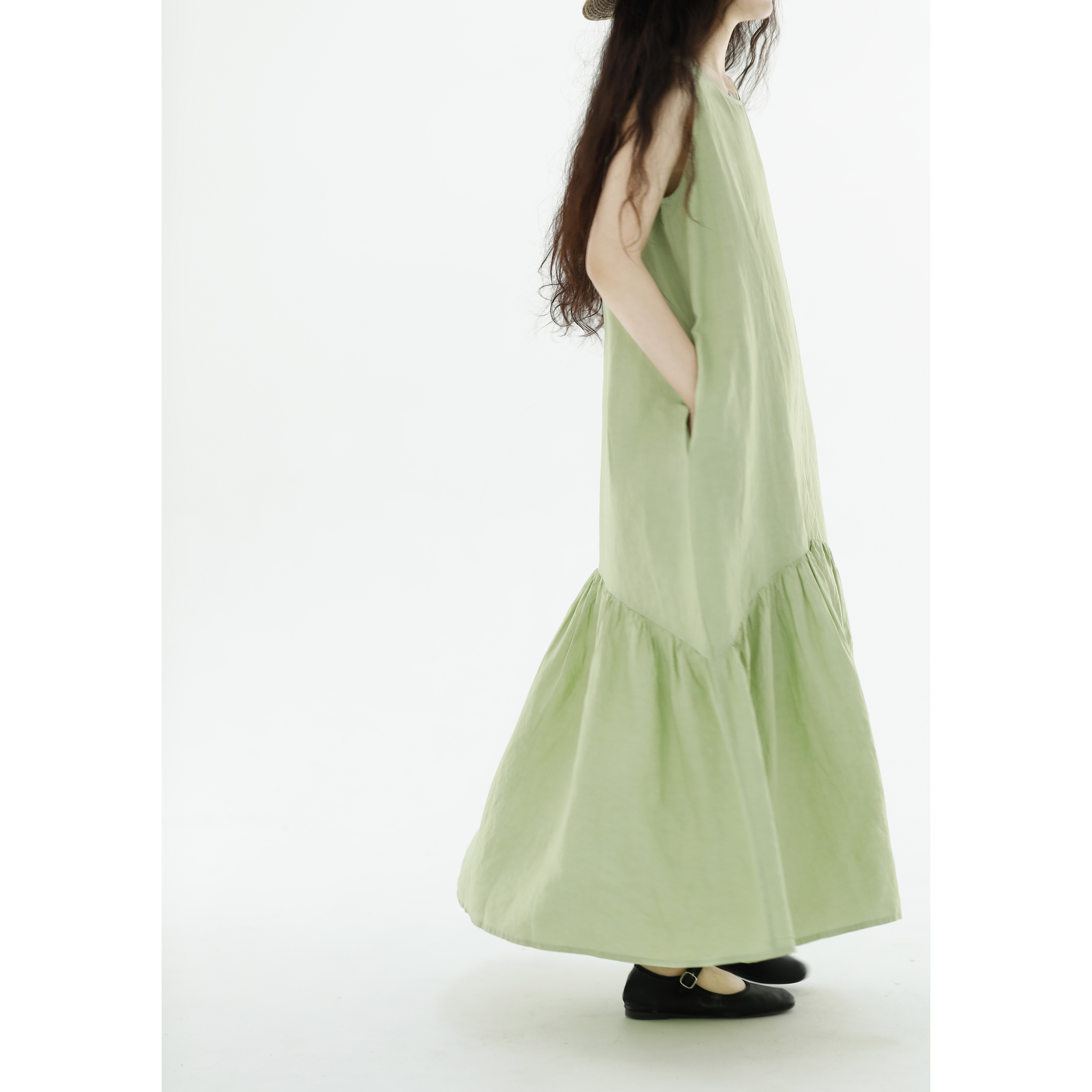 复述人丝亚麻小清新绿色无袖 连衣裙干爽挺括感浅葱绿鱼尾背心裙女