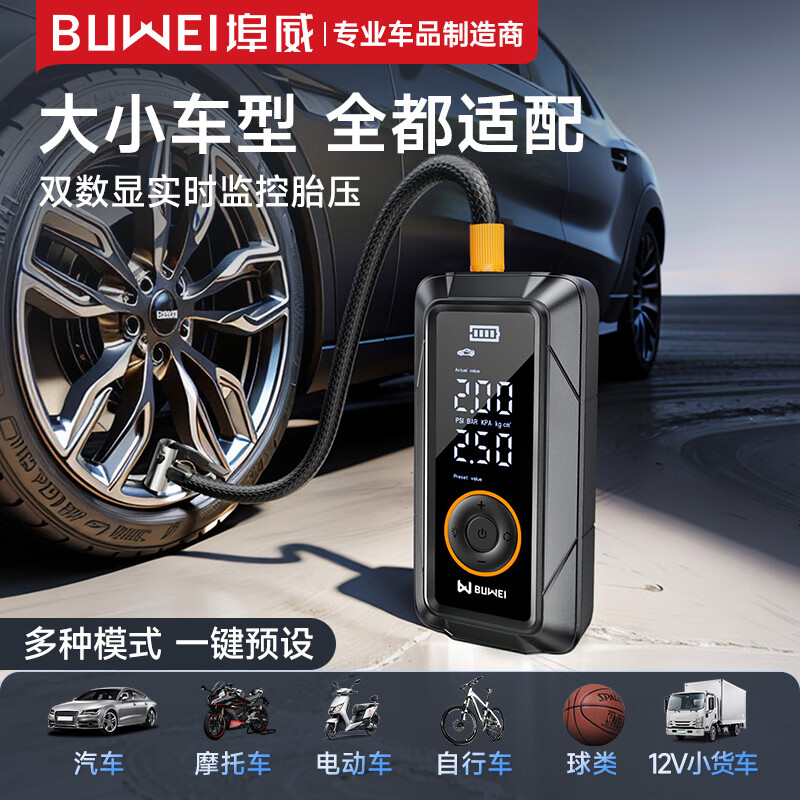 埠威车载充气泵无线汽车轮胎打气泵带测胎压便携式 电动打气筒车用