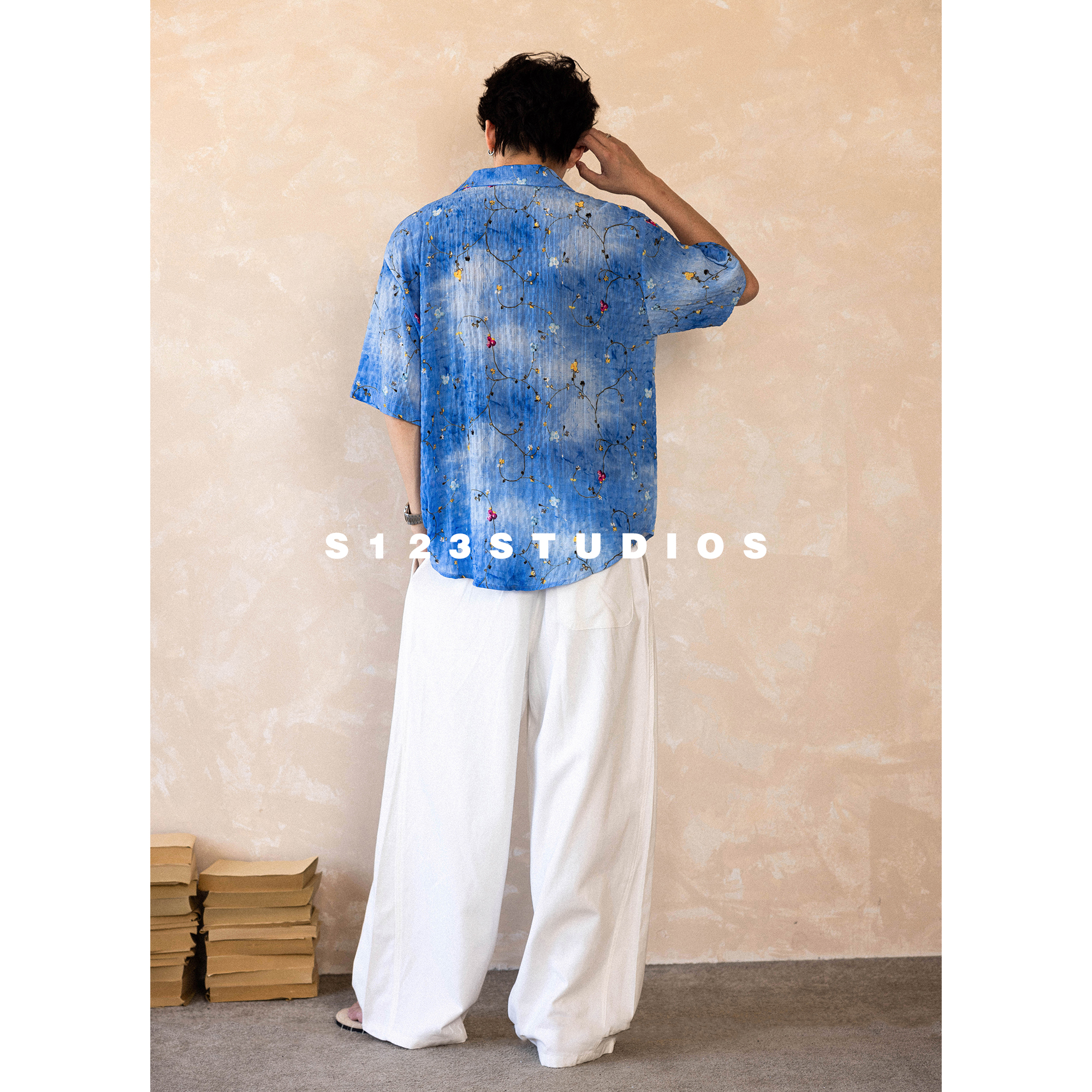 痞帅高级感休闲男装 美式 男夏季 衬衫 古巴领衬衣 黑色肌理感提花短袖