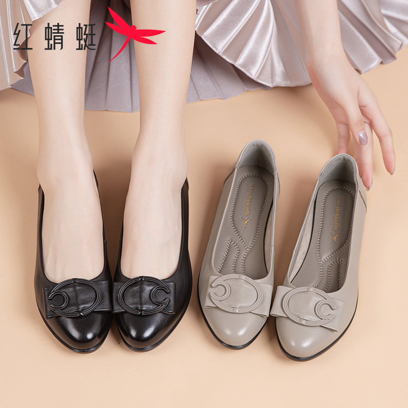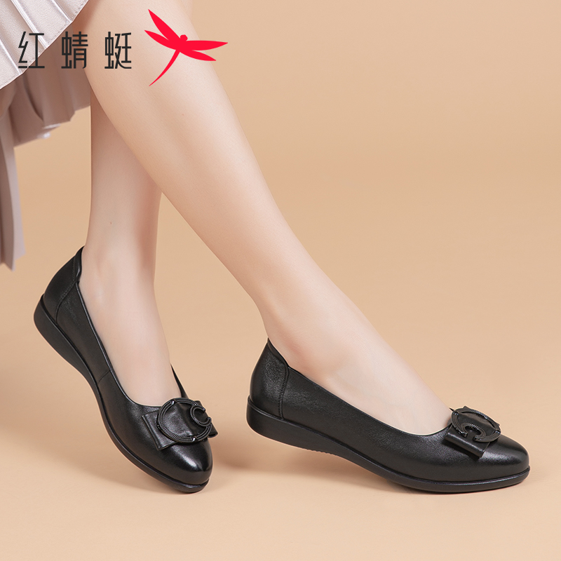 舒适软底浅口平底女单鞋 红蜻蜓女鞋 真皮中老年妈妈鞋 新款 2025夏季