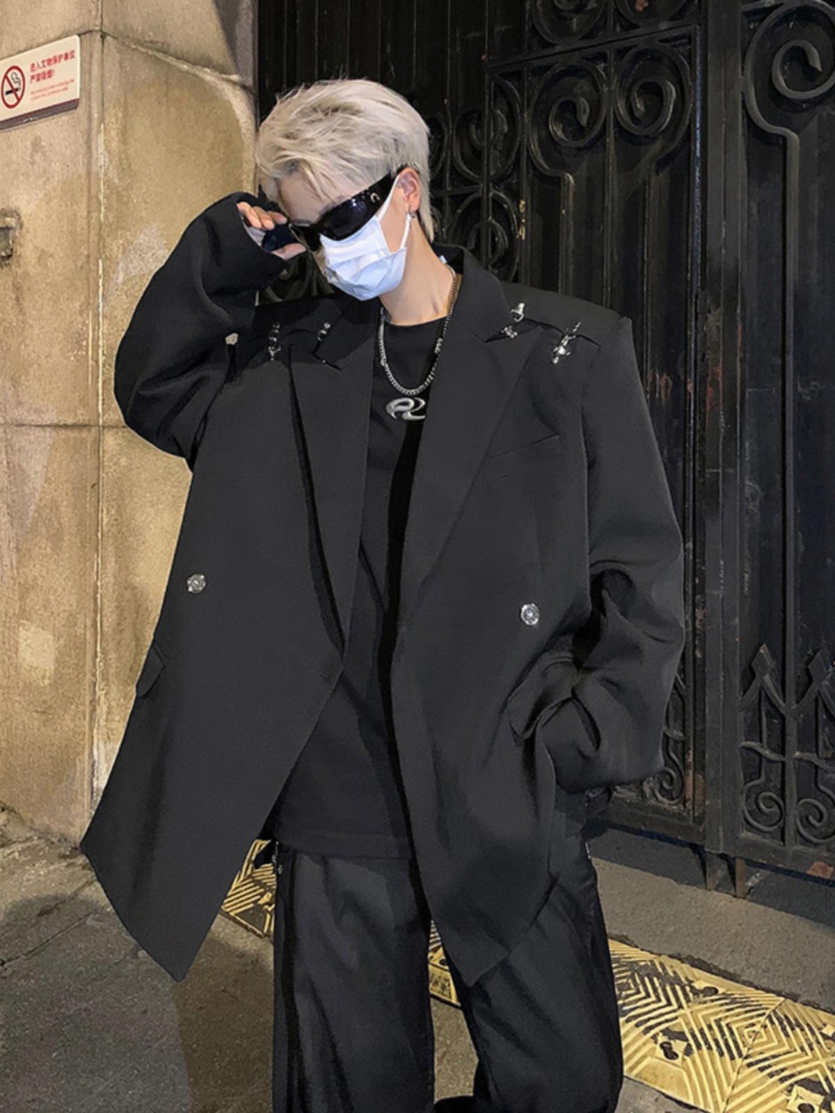 高级感韩版 男式 垫肩dk西服春秋搭配一整套 套装 金属飞机扣拼接西装