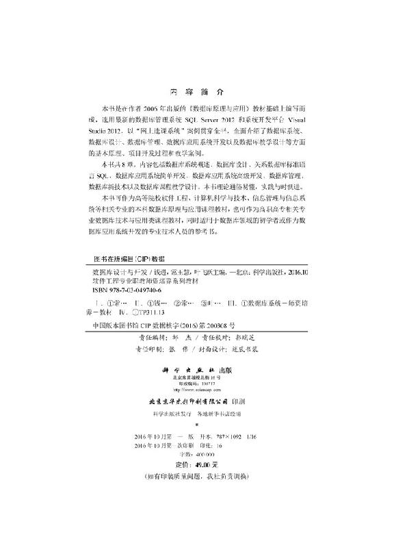 钱进 常玉慧 叶飞跃 社 数据库设计与开发 科学出版 9787030497406书籍KX 书