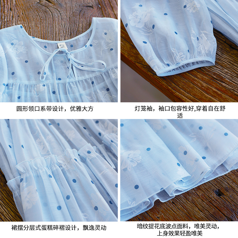 新款 文艺蓝波点印花连衣裙女2025夏季 浪漫飘逸蛋糕裙 凝纱浅梦