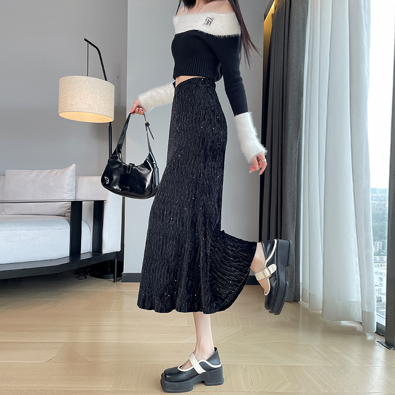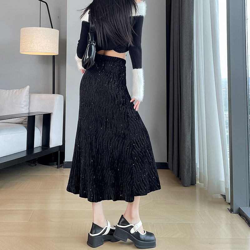 肌理感丝绒鱼尾裙女秋冬高腰A字显瘦气质包臀女人味烫钻半身长裙