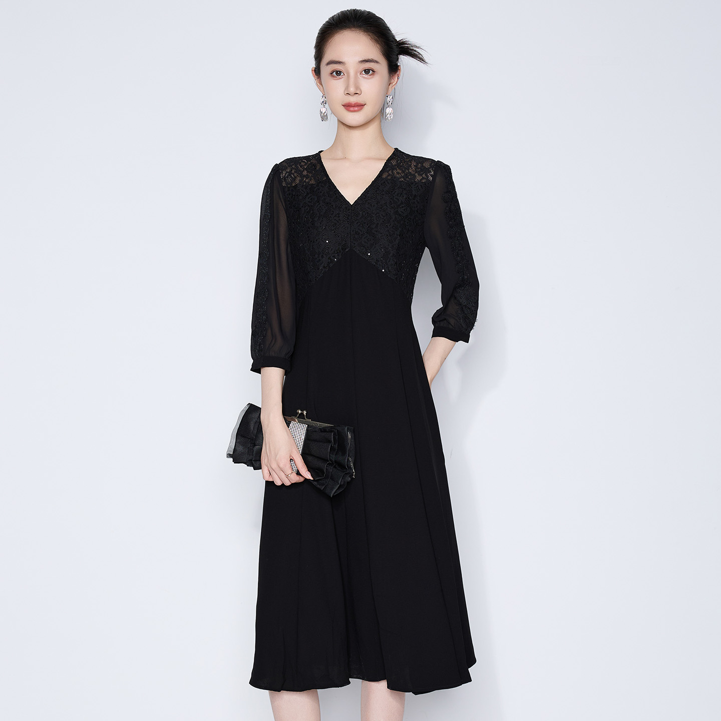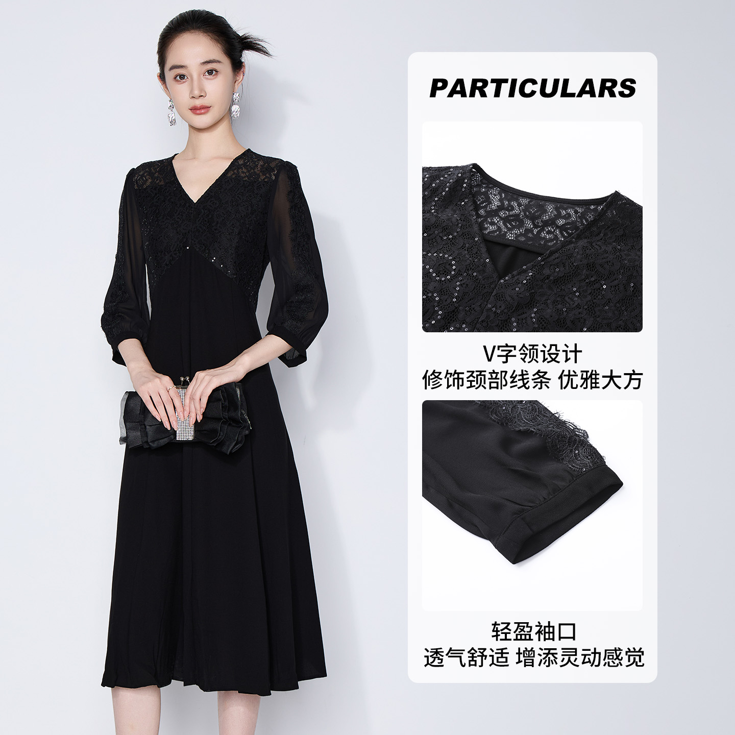 气质法式 黑色蕾丝亮片连衣裙子V领收腰时尚 女 新款 马天奴2025夏季