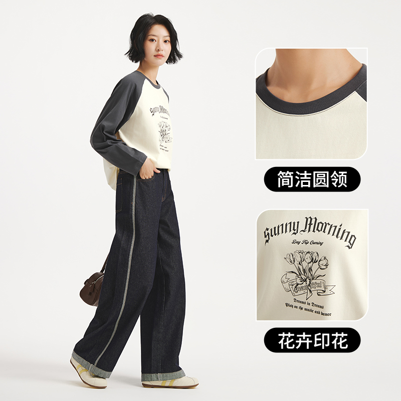 T恤全棉舒适插肩袖 女士花卉字母长袖 宽松百搭 新款 热风2025年秋季
