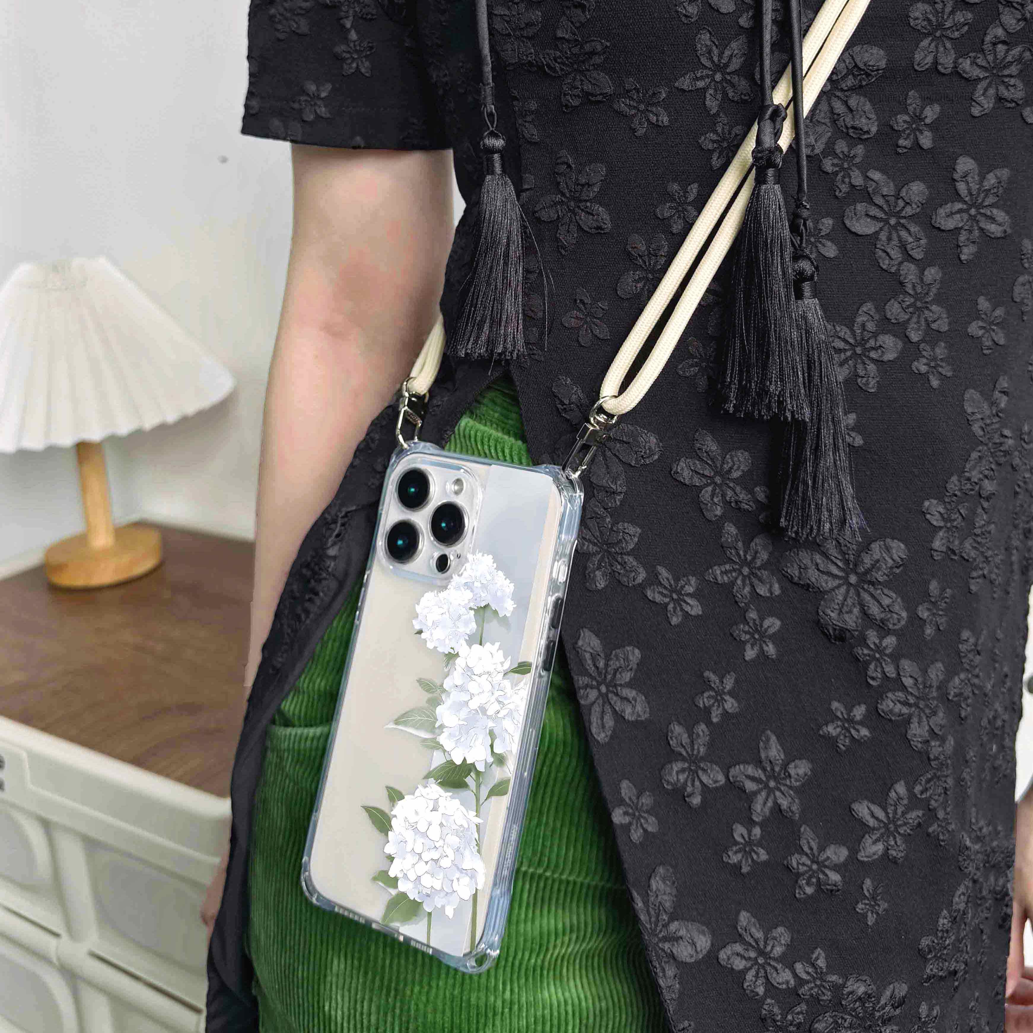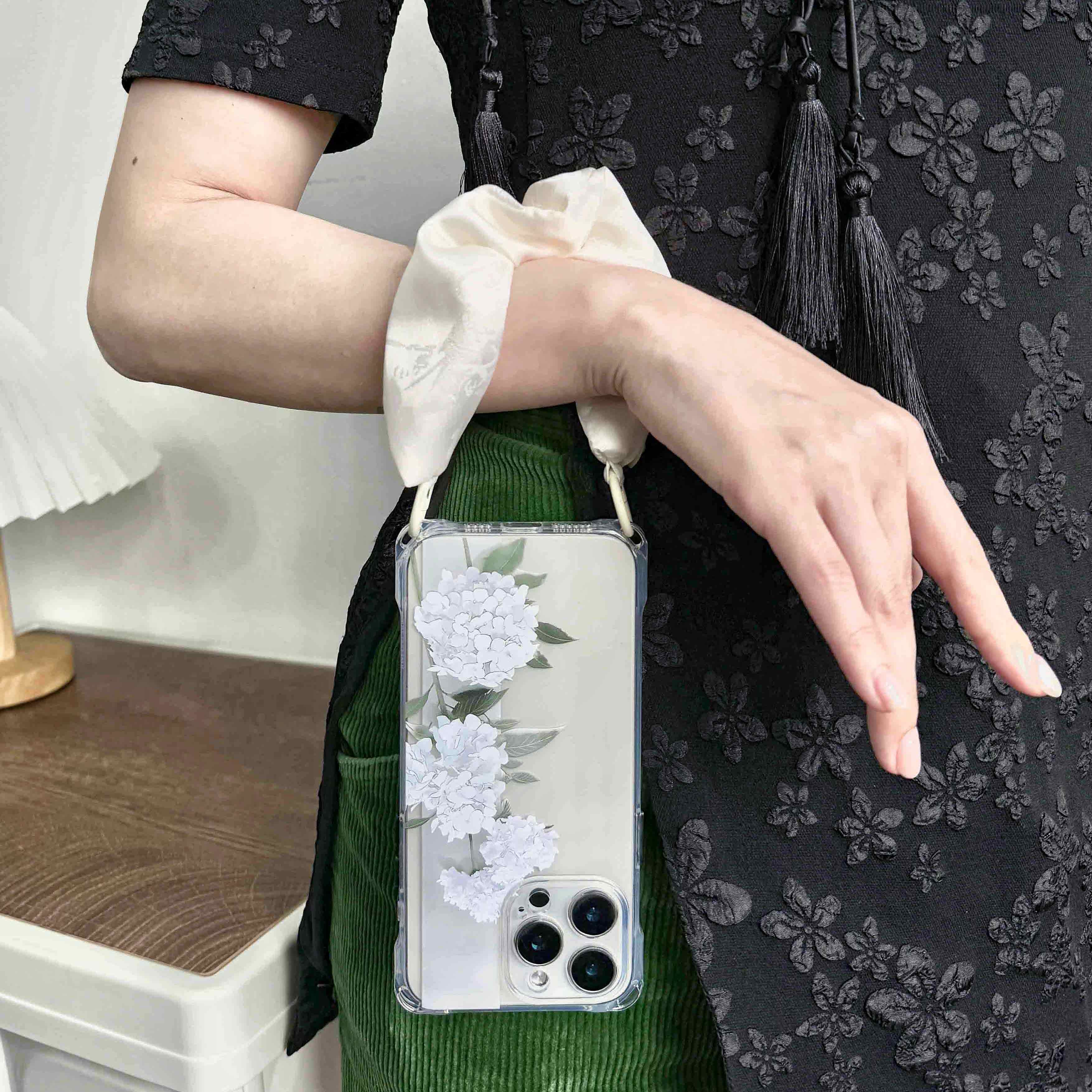 素雅简约白花16Promax挂绳手机壳适用于荣耀苹果iPhone14plus手提绸缎绳mate70防摔手提小米15斜挎侧背式 oppo