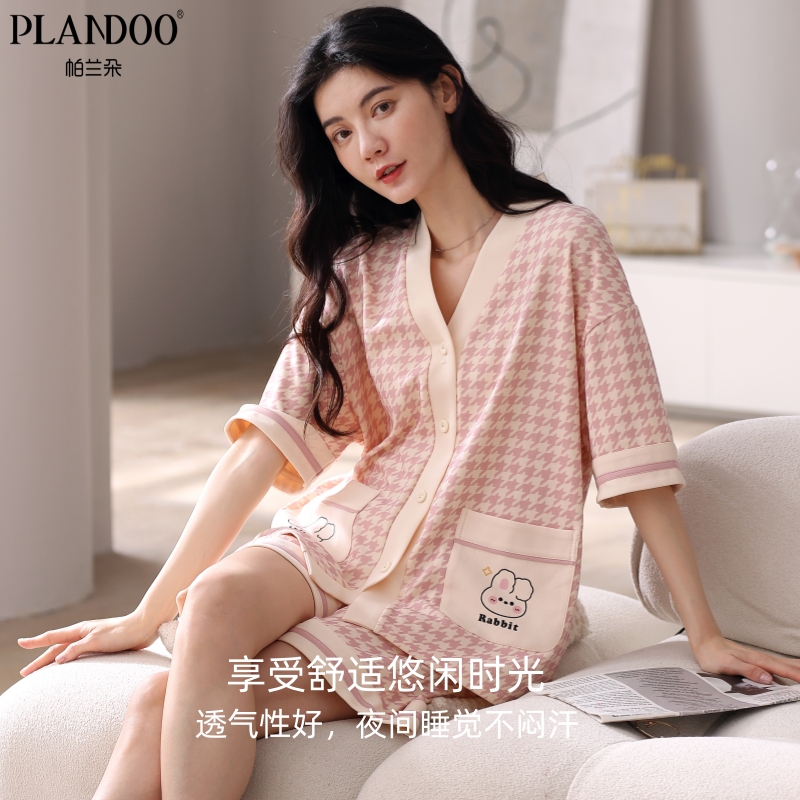 家居服夏季 帕兰朵女士睡衣纯棉舒适短袖 简约大码 套装 可外穿 短裤