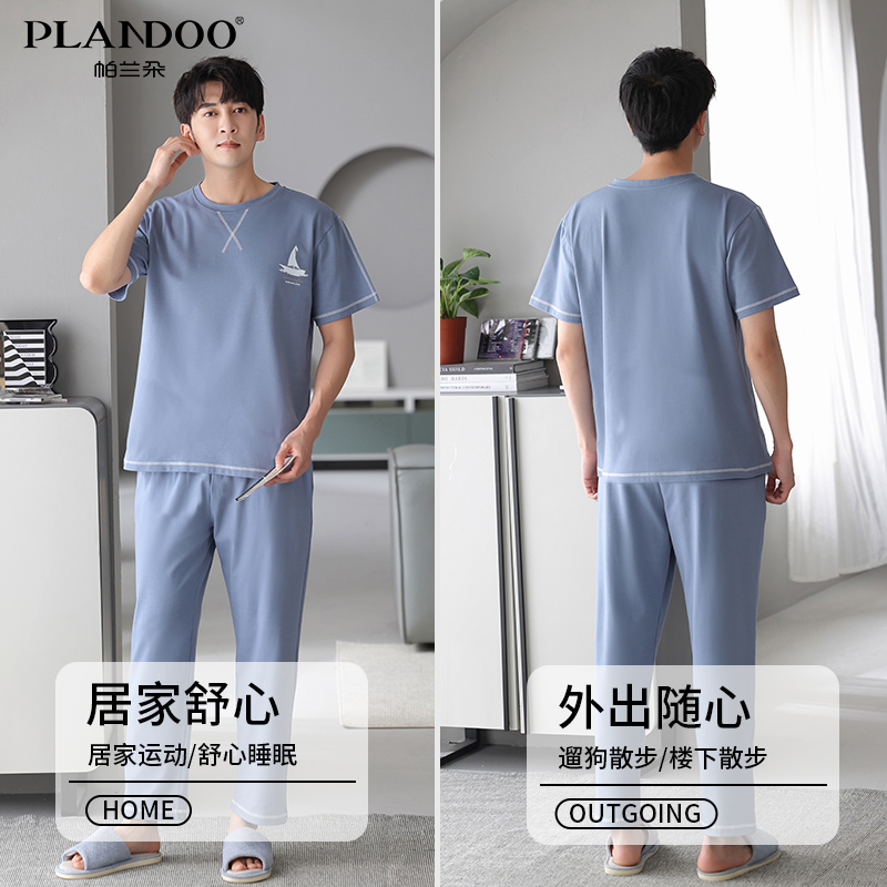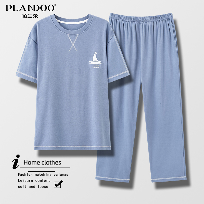 夏季 简约宽松圆领套装 纯棉短袖 家居服夏天夏款 长裤 帕兰朵睡衣男款