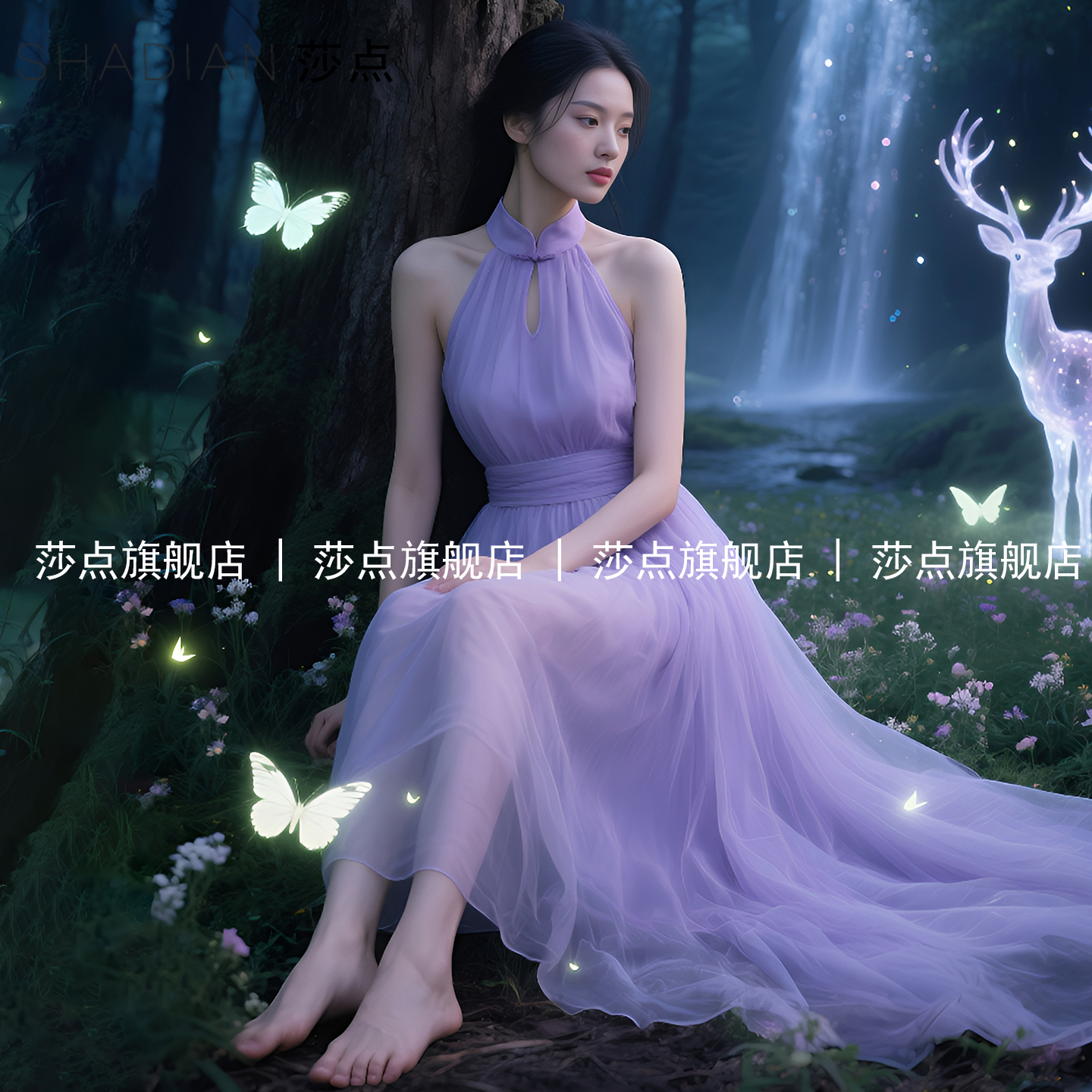 薄纱度假雪纺收腰长裙 气质无袖 新中式 紫色挂脖连衣裙女夏2025新款