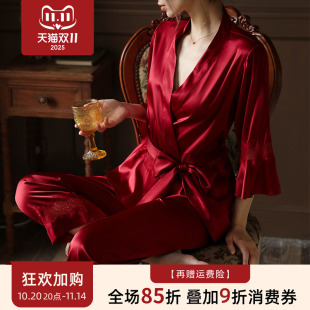 睡衣套装 红色结婚蕾丝真丝睡衣女性感桑蚕丝家居服短款 睡袍长裤
