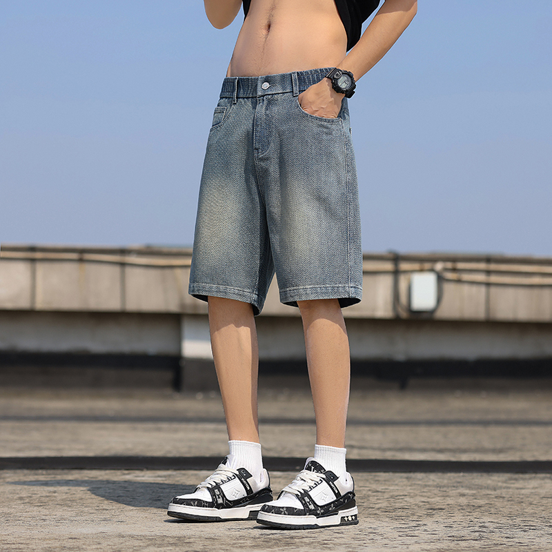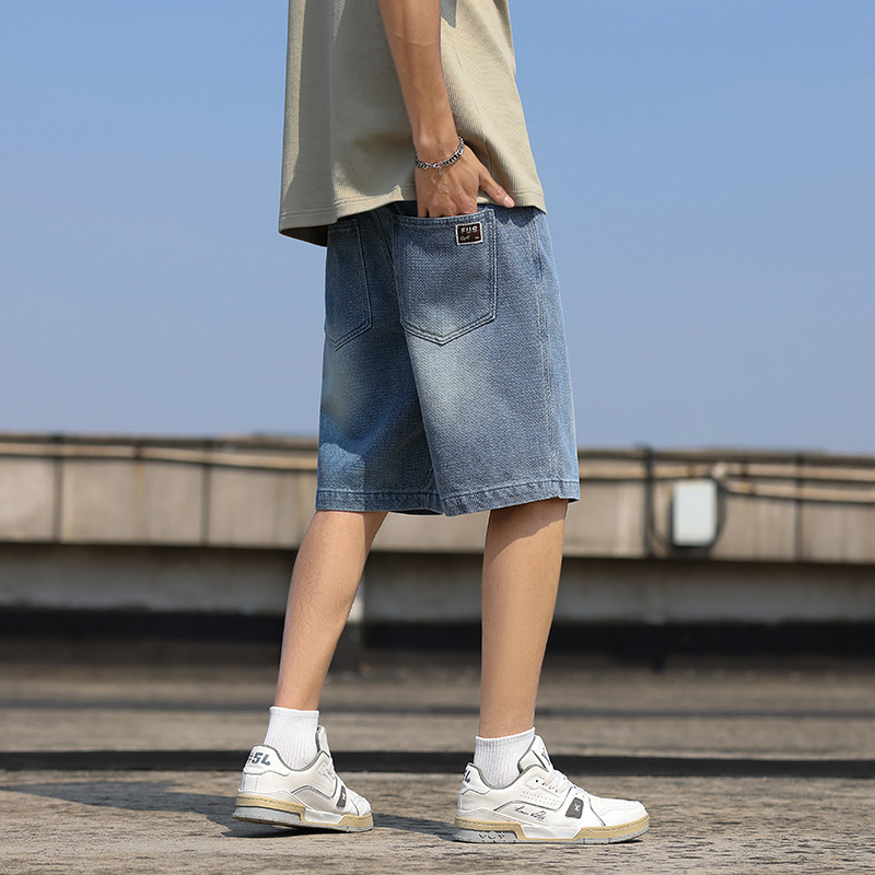 青少年高街痞帅复古水洗宽松直筒五分中裤 夏季 男款 浅蓝色牛仔短裤